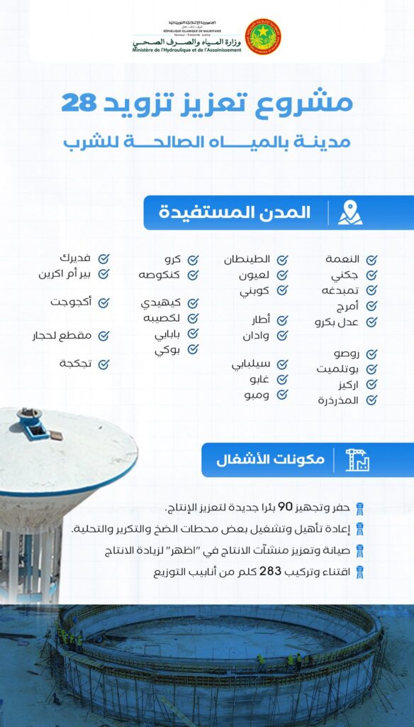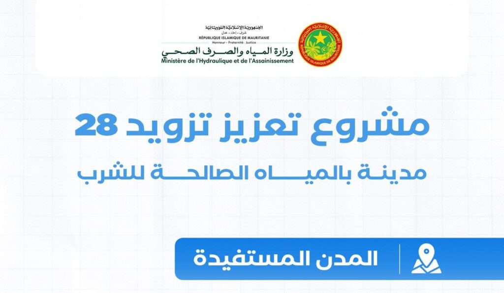 الريادة: أطلقت وزارة المياه والصرف الصحي مشروعًا لتعزيز التزويد بالمياه الصالحة للشرب في 28 مدينة . موزعة على مختلف ولايات البلاد، وذلك في إطار تنفيذ برنامج رئيس الجمهورية، السيد محمد ولد الشيخ الغزواني. الرامي إلى ضمان وصول آمن ومستدام للمياه الصالحة للشرب.