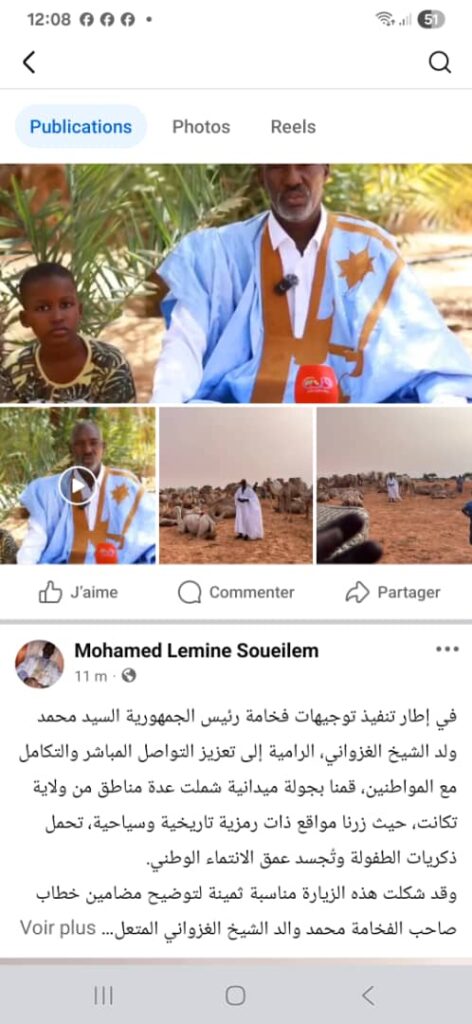 وفي تدوينة نشرها على حسابه في منصة “فيسبوك”، وصف ولد اسويلم الجولة بأنها “مناسبة ثمينة. لتوضيح مضامين خطاب فخامة الرئيس المتعلقة بأهمية. العودة إلى الأهالي، وصلة الرحم، وتشجيع السياحة الداخلية”، معتبرًا هذه المبادئ روافد. لتعزيز اللحمة الوطنية وترسيخ قيم الإنصاف والتقارب في تسيير الشأن العام.