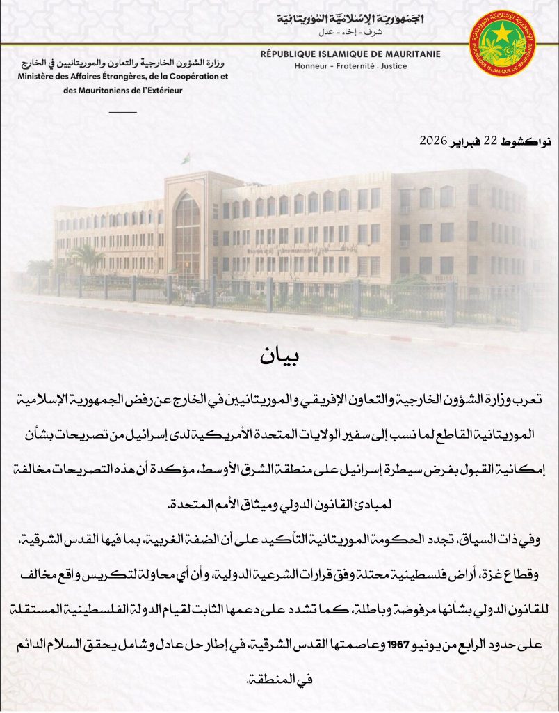 الريادة: أعربت وزارة الشؤون الخارجية والتعاون الإفريقي والموريتانيين في الخارج عن رفض الجمهورية الإسلامية الموريتانية. القاطع لما نُسب إلى سفير الولايات المتحدة الأمريكية لدى إسرائيل بشأن إمكانية القبول بفرض سيطرة إسرائيل على منطقة الشرق الأوسط.