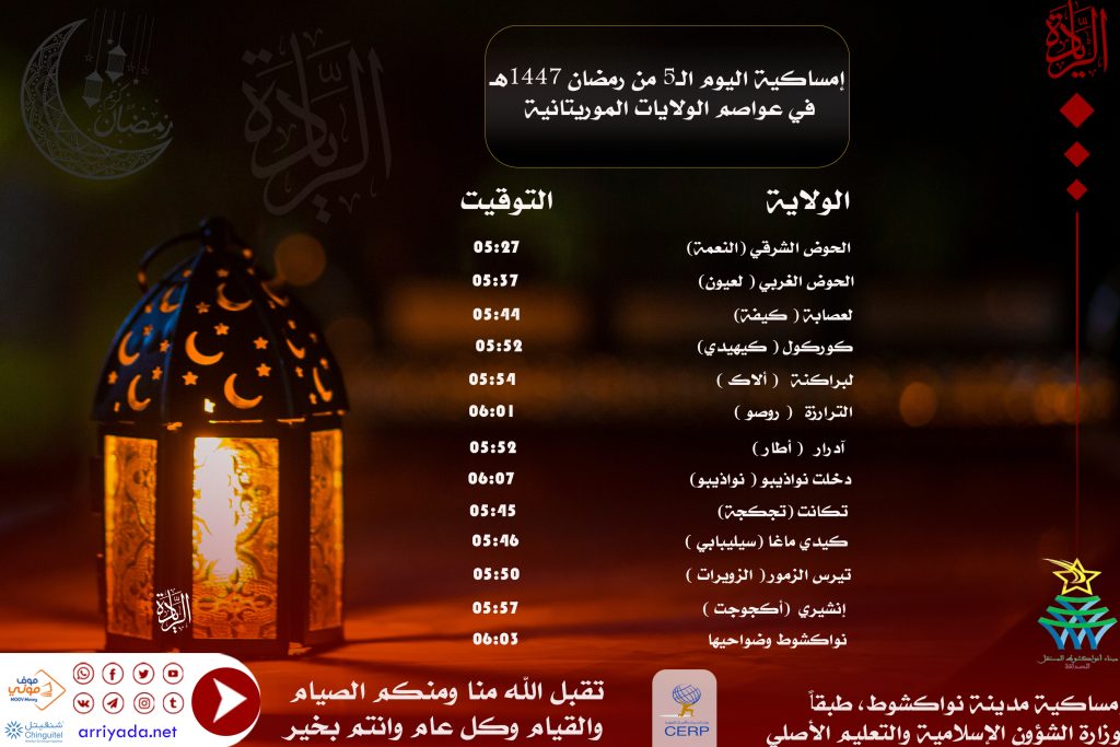 مواقيت الإمساك ليوم غدٍ الاثنين (05 رمضان) في عواصم الولايات الموريتانية