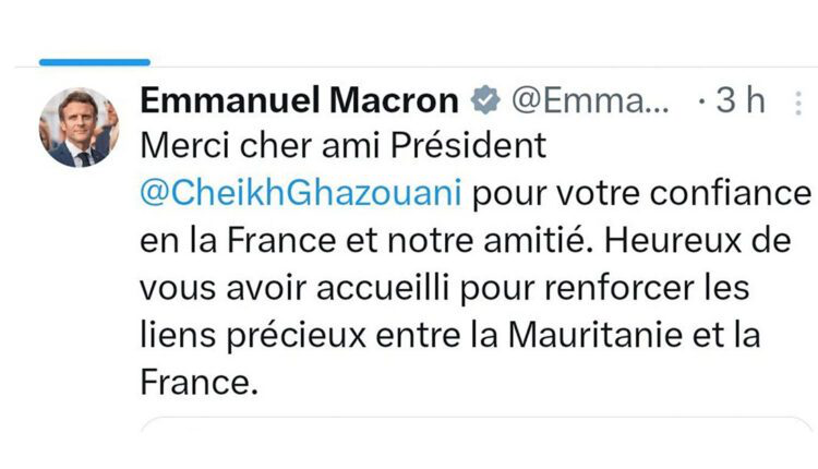 الريادة : عبر الرئيس الفرنسي، إيمانويل ماكرون، عن خالص شكره وتقديره لرئيس الجمهورية، محمد ولد الشيخ الغزواني، مثمنا الثقة التي يوليها لفرنسا.