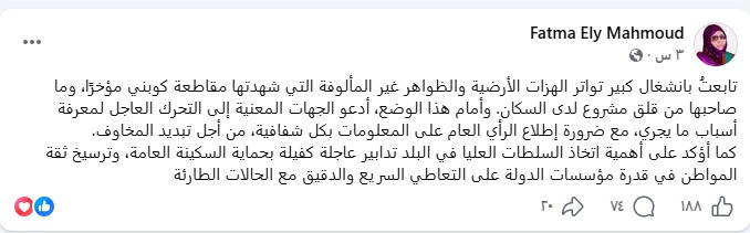 الريادة: دعت نائب مقاطعة كوبني، السيدة فاطم بنت أعل محمود، الجهات المعنية إلى التحرك العاجل لمعرفة . أسباب الهزات الأرضية والظواهر غير المألوفة التي شهدتها المقاطعة مؤخرا، وما صاحبها من حالة قلق بين السكان.