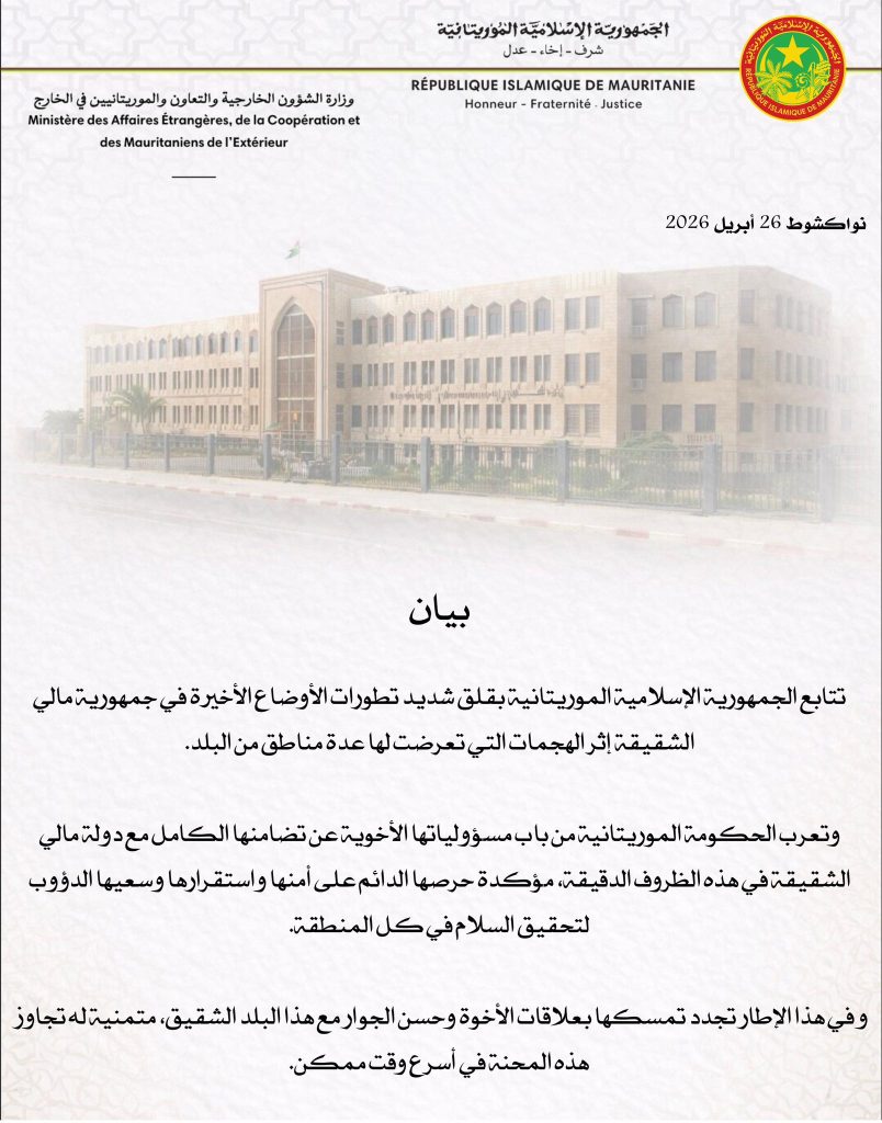 وقالت وزارة الشؤون الخارجية والتعاون والموريتانيين في الخارج، في بيان صادر من العاصمة نواكشوط بتاريخ 26 أبريل 2026، إن الحكومة الموريتانية تتابع عن كثب الأوضاع الراهنة في مالي، معبرةً عن تضامنها الكامل مع هذا البلد الشقيق في مواجهة التحديات الأمنية التي يمر بها.