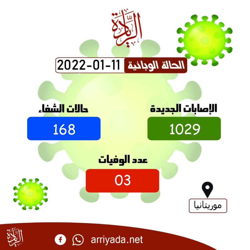 الريادة/ أعلنت وزارة الصحة اليوم الثلاثاء ، عن الحالة الوبائية اليومية لكوفيد 19 في موريتانيا. حيث تم تسجيل 1029 إصابة جديدة، و 168 خالة شفاء، و3 حالات وفاة بفيروس كورونا، خلال الأربع والعشرين ساعة الماضية.